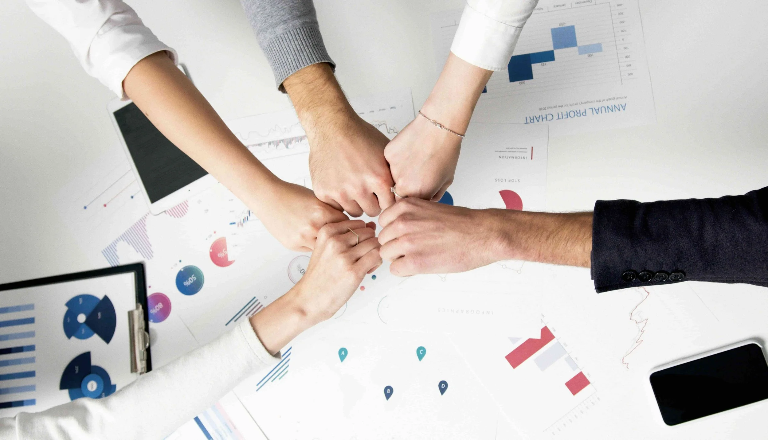 Four people are joining their fists together on a table with various charts, graphs, and a tablet visible, symbolizing teamwork or collaboration.